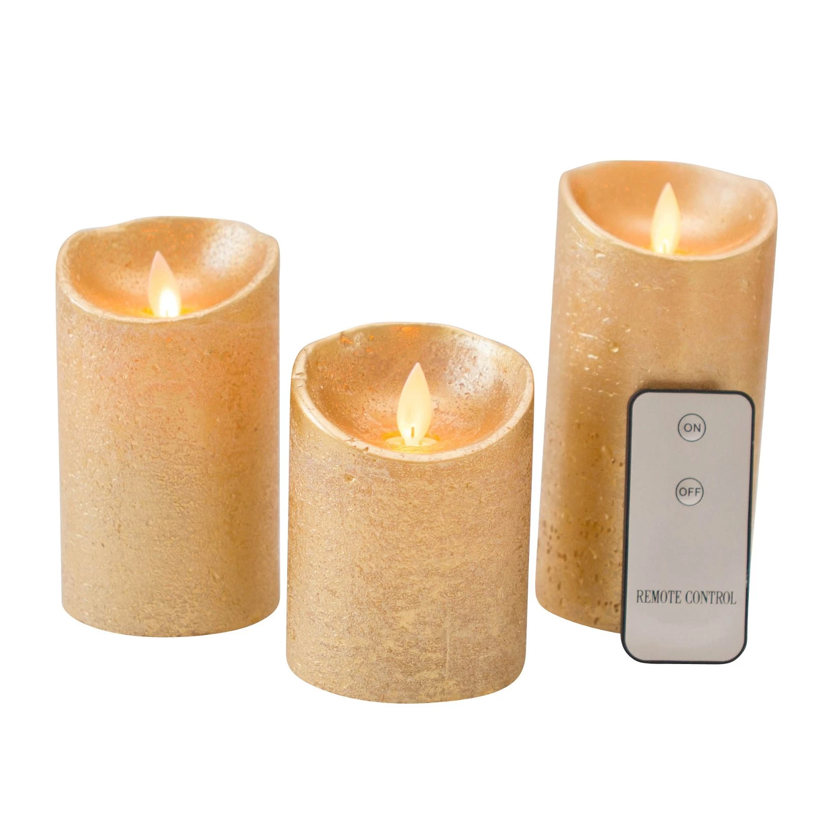 3er-Set LED-Echtwachskerze, Magic Flame, Gold, Fernbedienung, Batterie