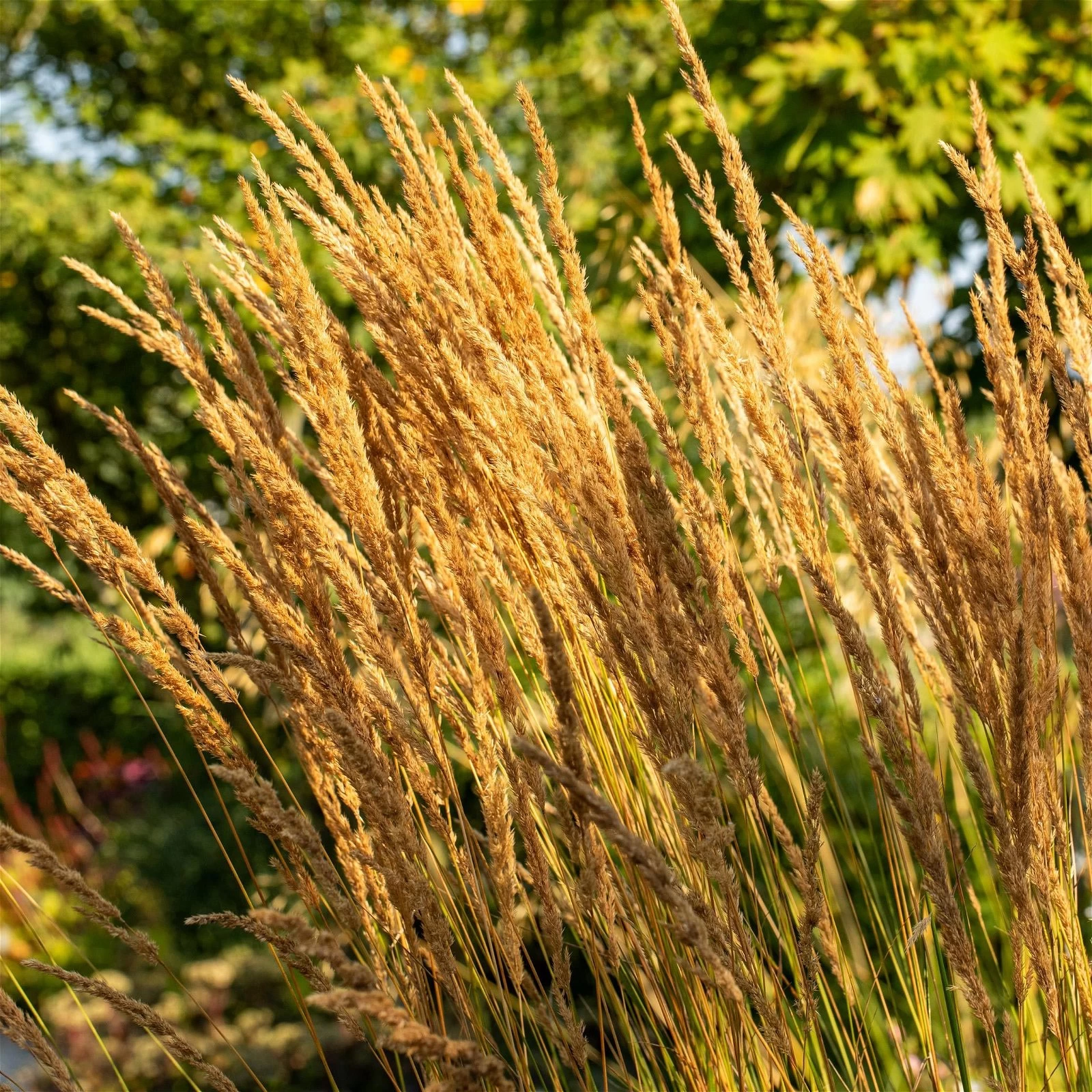 Die winterharte, standfeste Staude überzeugt mit besonders einfacher Pflege und einem hohen Zierwert. Sie treibt bereits im zeitigen Frühjahr aus und erfreut im Sommer mit üppigen, beigefarbenen Ähren, die sich im Herbstverlauf gelb verfärben und die Pflanze bis in den Winter schmücken. Besonders in Rabatten oder am Teichrand sorgt das dekorative Gras über viele Wochen für einzigartige, raffinierte Leichtigkeit.