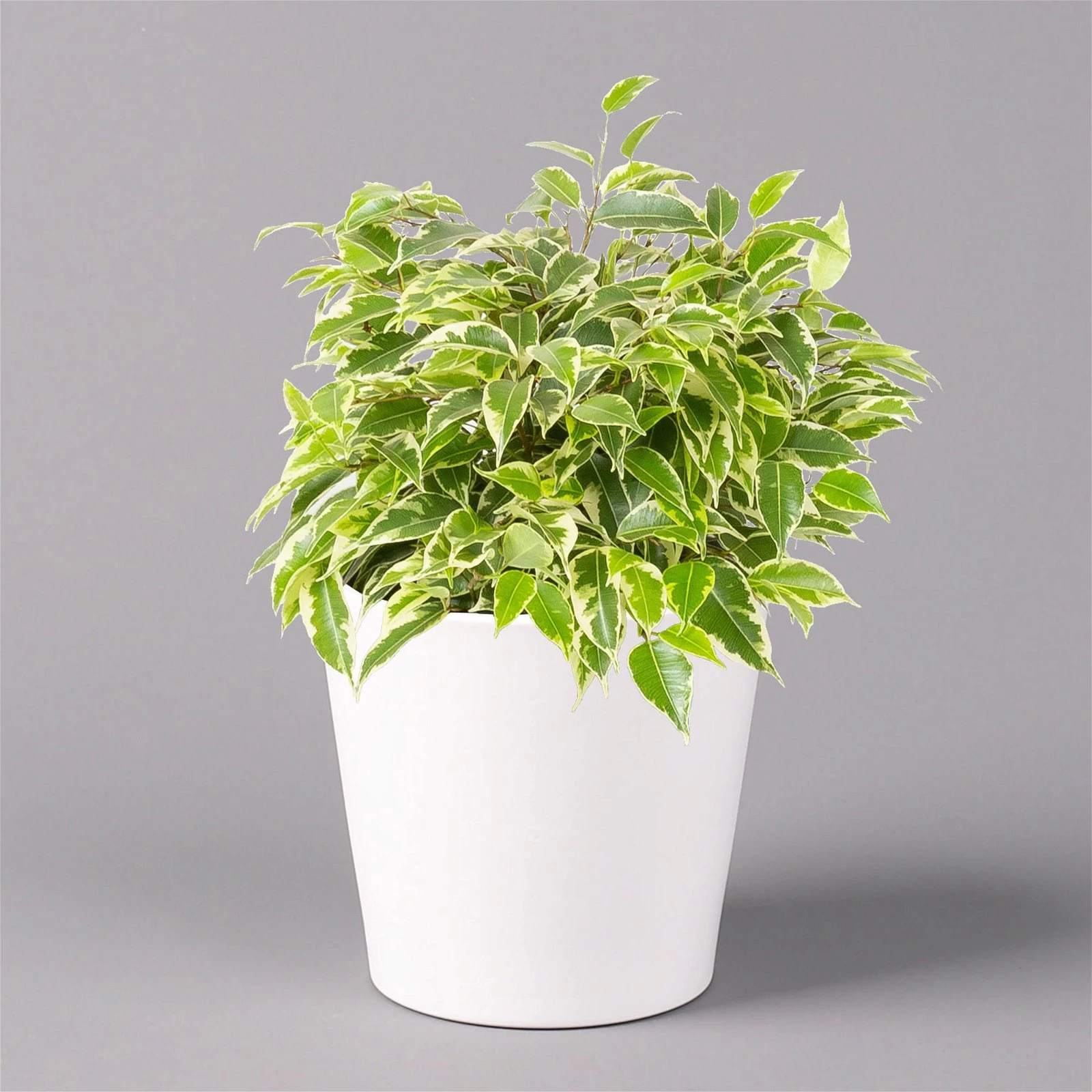 Die Birkenfeige (Ficus benjamina), bei uns auch unter den Namen ‚Benjamini‘ oder einfach nur ‚Ficus‘ bekannt, ist eine klassische Grünpflanze für Zimmer und Büro, die sich seit vielen Jahren großer Beliebtheit erfreut. Charakteristisch sind die elliptischen, zugespitzten Blätter, die je nach Art rein grün oder mit weißer bis gelber Panaschierung versehen sind. Die glänzenden, glatten Blätter sitzen an auffallend dünnen Zweigen, die an den Spitzen leicht überhängen. Die Sorte ‚Kinky‘ kann bei guter Pflege bis zu knapp 1 Meter hoch werden.