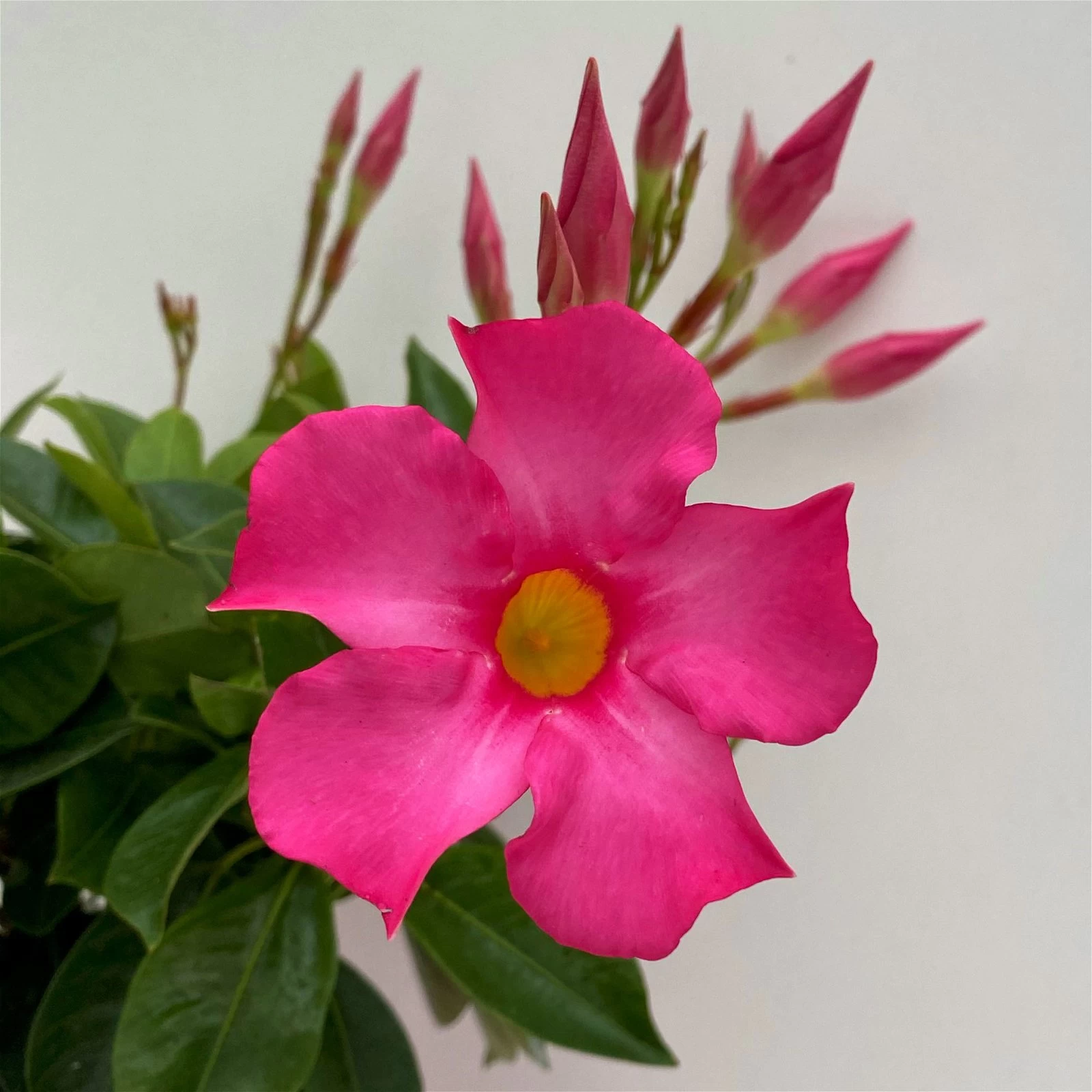 Die großen Blüten sind trichterförmig ausgebildet und begeistern in der Farbe Rosa. Von Mai bis Oktober setzt die Dipladenie schöne Akzente in Ihrem Zuhause.