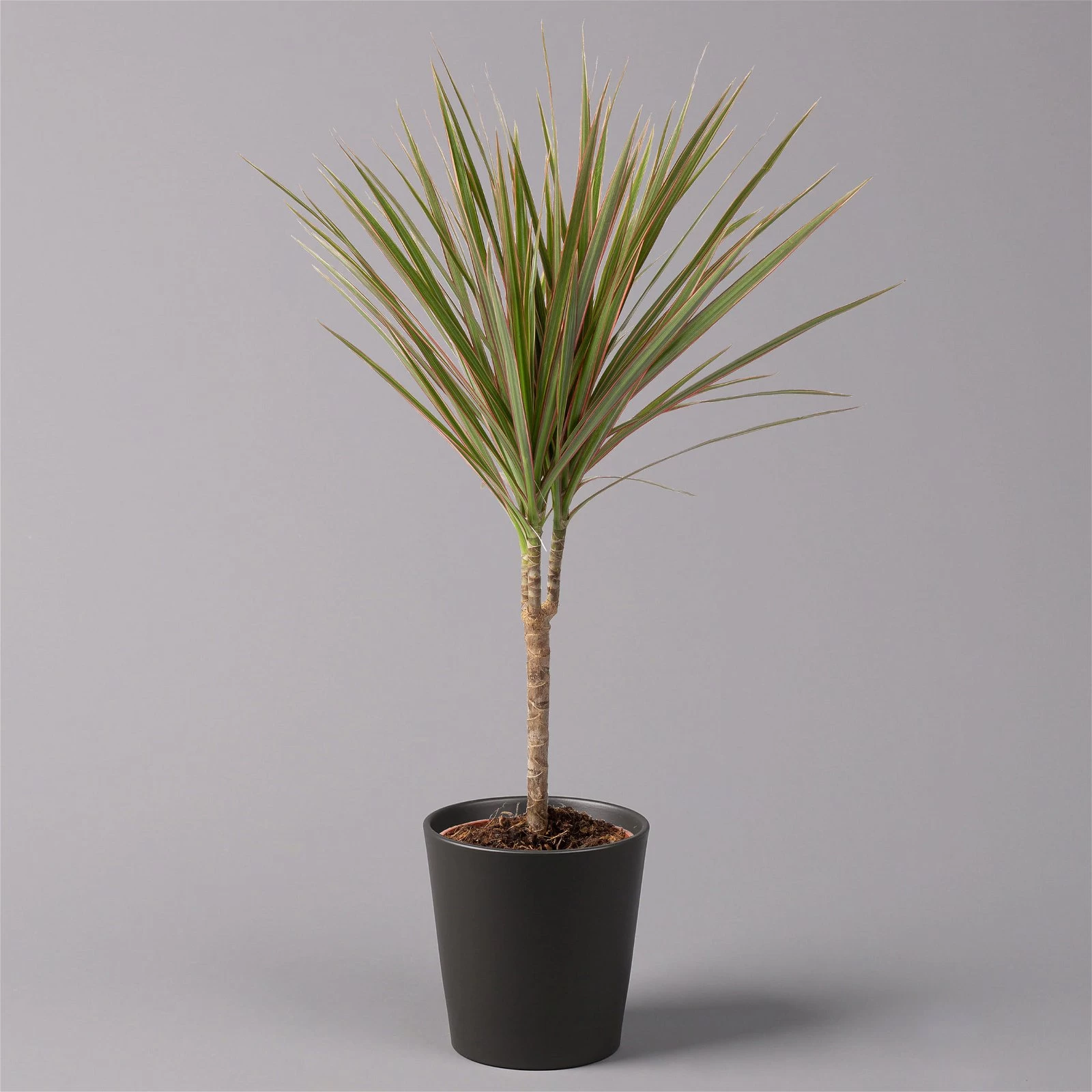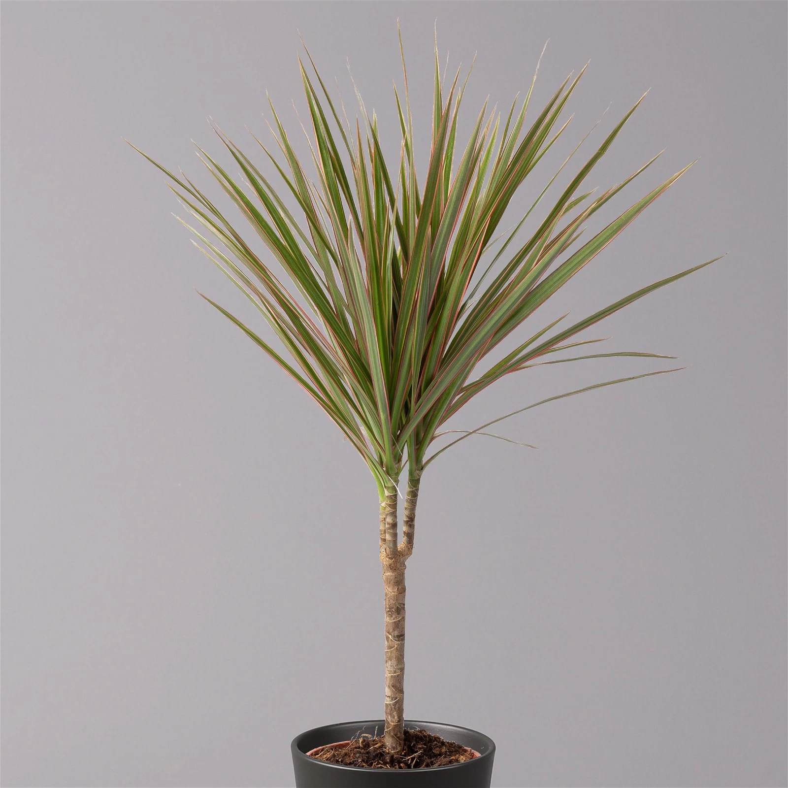 Er ist exotisch, auffällig gemustert und üppig geformt: Der Drachenbaum, auch Dracaena marginata ‚Bicolor‘ genannt. Diese Zimmerpflanze lässt sich an nahezu jeden Standort in Ihrer Wohnung oder im Büro aufstellen und schafft dadurch ein einzigartiges Ambiente. Nicht nur optisch wertet der Drachenbaum den Innenbereich auf, sondern filtert auch Schadstoffe aus der Luft. Fühlen Sie sich wie in der freien Natur und genießen Sie herrlich frische Luft! Die roten Streifen der schmalen Blätter sind zudem ein wahrer Hingucker. Nicht umsonst verdient diese Pflanze ihren Namen, denn das Muster erinnert an ein beeindruckendes Fabelwesen der chinesischen Kultur. Um diese Struktur zu erhalten, sollten Sie regelmäßig ein wenig Grünpflanzendünger zum Substrat geben. Tipp: Verfärben sich die Blätter und weisen gelbe Flecken auf, sollten Sie die Wasserzufuhr etwas reduzieren.