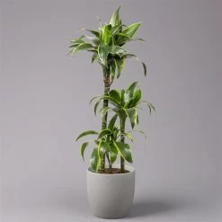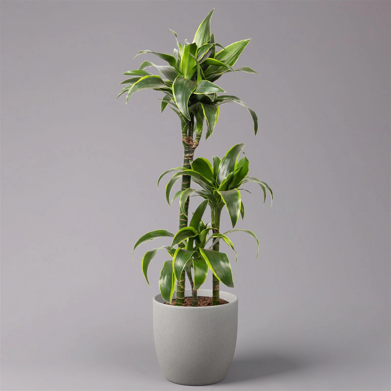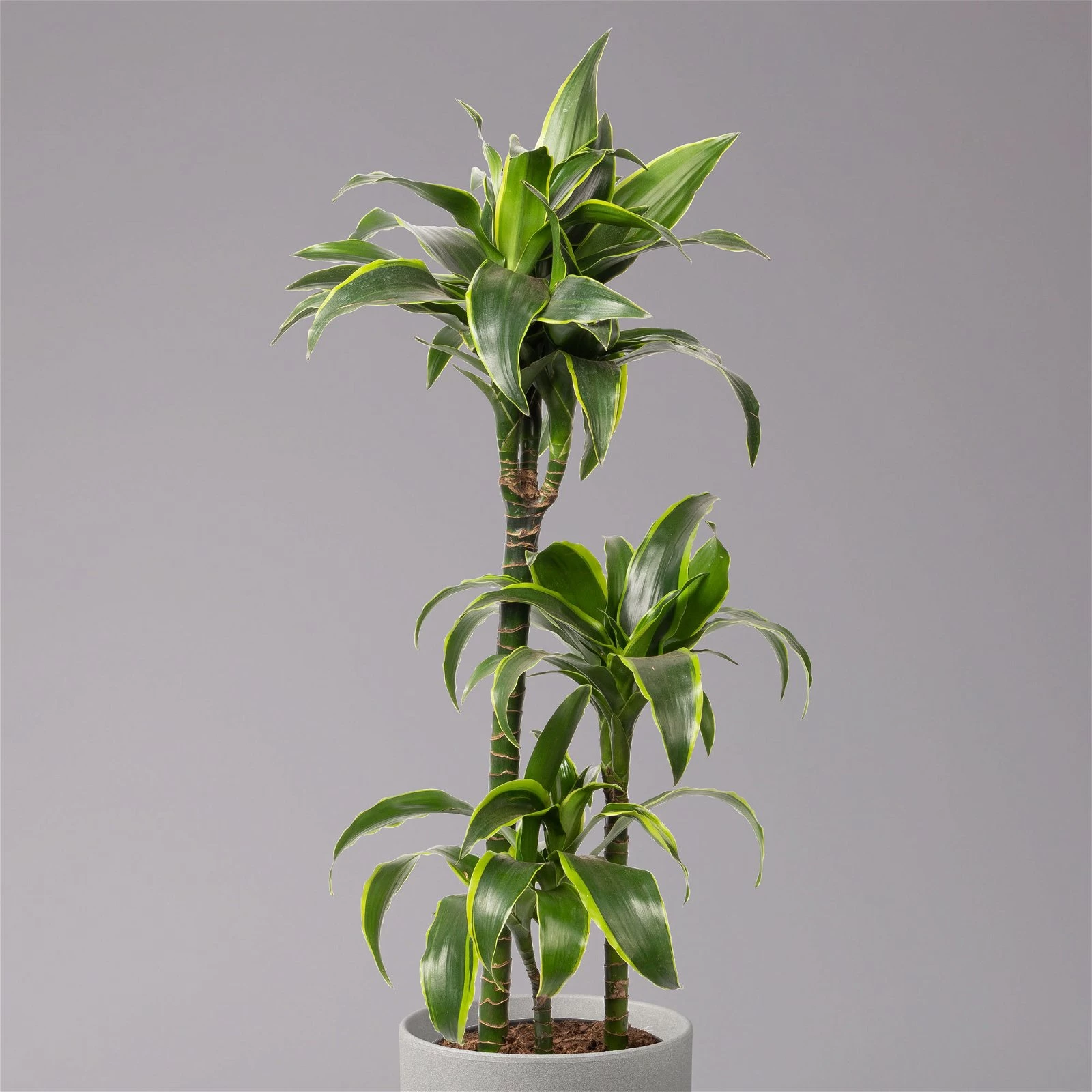 Sie erhalten Ihre Dracaena fragrans ‚Dorado‘ in einem 3er-Tuff mit unterschiedlich hohen Stämmen, um einen beeindruckenden immergrünen Akzent im Wohn- oder Arbeitszimmer zu setzen. Diese ungewöhnliche Zimmerpflanze sieht dank ihrer relativ breiten Blätter mit einer filigranen gelben Umrandung effektvoll aus. Dabei ist die Dracaena fragrans ‚Dorado‘ wie alle Drachenbäume ein leistungsstarker, natürlicher Luftfilter. Mithilfe dieser Wohlfühlpflanze verbessern Sie dauerhaft das Raumklima. Es sind vor allem Formaldehyd und Benzol, die ein Drachenbaum der Luft entzieht. Da sich diese gesundheitsschädlichen Substanzen unter anderem beim Betrieb der modernen Bürotechnik sowie beim Rauchen oder Kochen bilden, stellt die Dracaena ‚Dorado‘ für ein Büro, eine Küche oder Raucherwohnung die richtige, pflegeleichte Lösung dar. Ihre Dracaena fühlt sich an einem halbschattigen Standort wohl und benötigt nur wenig Wasser.