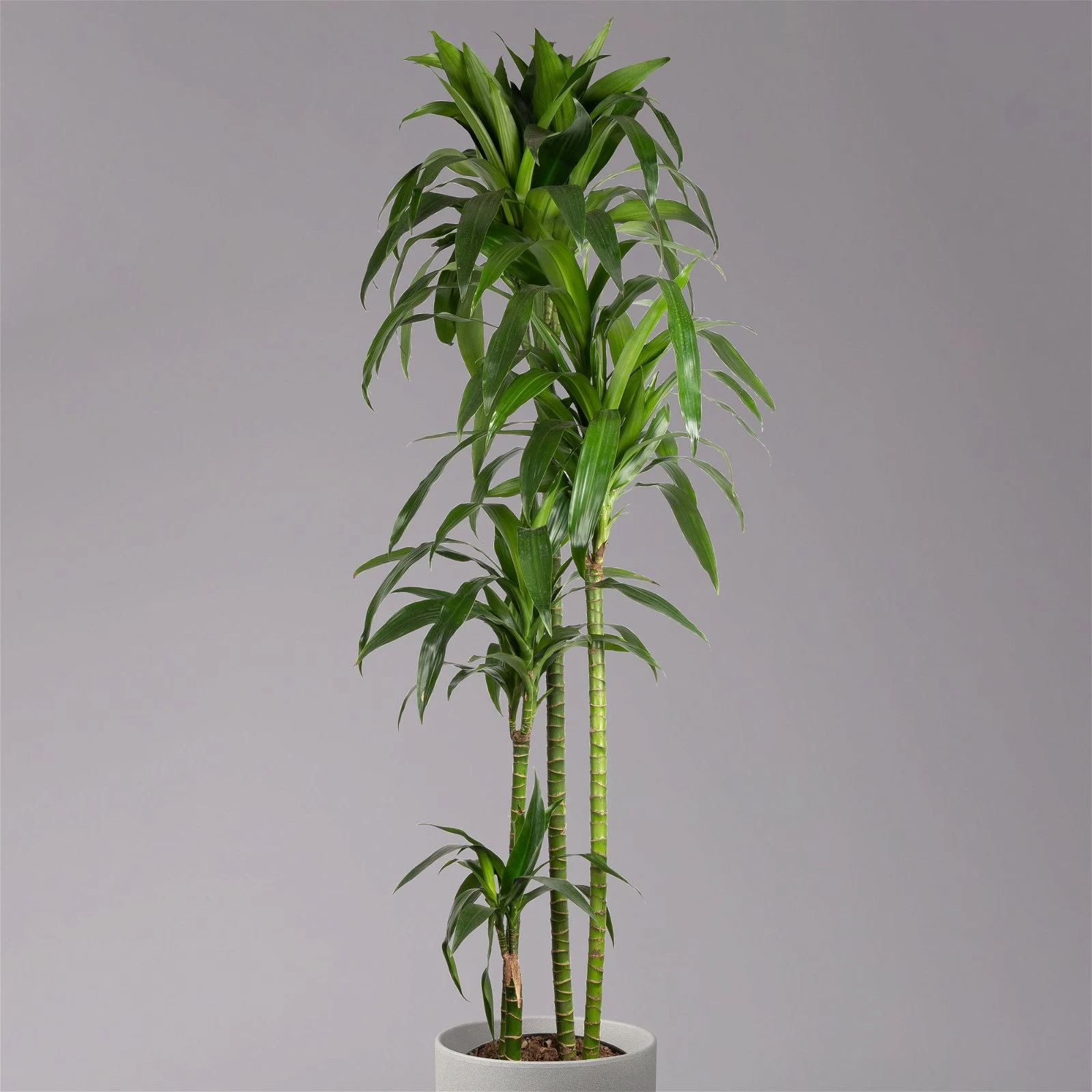 Der effektvolle Drachenbaum ‚Janet Craig‘ erhalten Sie in einem 4er-Tuff mit unterschiedlich hohen Stämmen. Ein Drachenbaum ist immer dann die treffende Wahl, wenn es um eine unkomplizierte Raumbegrünung geht. Jedoch ist die Dracaena ‚Janet Craig‘ nicht nur ein natürlicher, immergrüner Akzent in Ihrem Zuhause oder Büro, sondern auch ein ausgesprochen effizienter Luftfilter. Dieses Spargelgewächs vermag es nämlich, der Luft schädliche Benzole und Formaldehyde zu entziehen und somit für ein gesundes Raumklima zu sorgen. Alles in allem erweist sich die Dracaena als eine anspruchslose, wärmeliebende Zimmerpflanze mit einem moderaten Wasserbedarf. Ihr Drachenbaum profitiert von einem hellen Standort ohne direkte Sonne und entwickelt sich dank regelmäßiger Düngemittelgaben harmonisch.