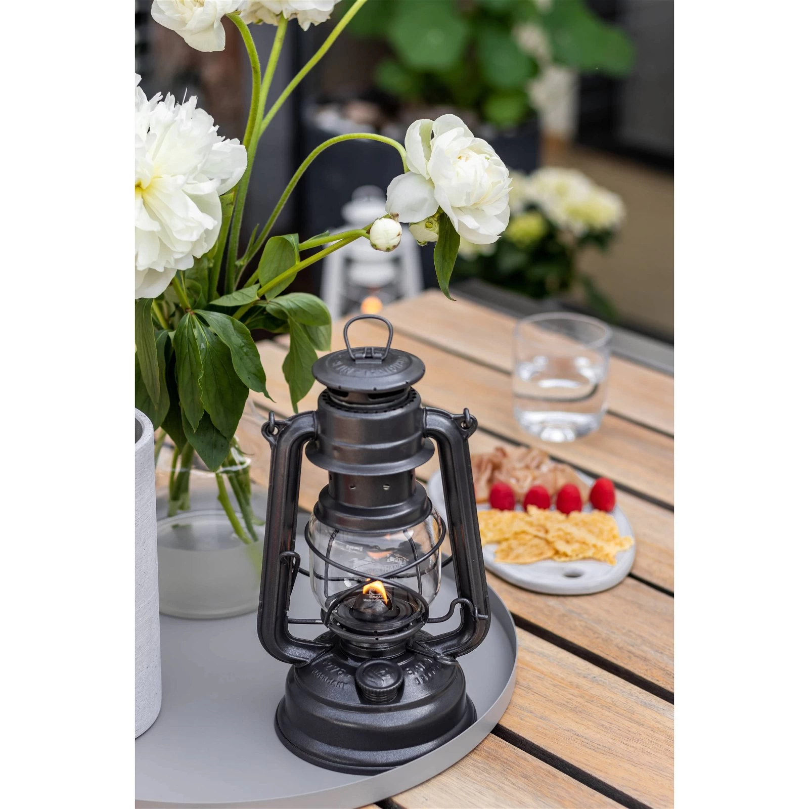 Mit der Sturmlaterne ‚Baby Special 276‘ ist für Beleuchtung im Außenbereich bestens gesorgt. Die Sturmlaterne von Feuerhand in leuchtendem sparkling iron überzeugt mit einem ruhigen Flammenbild und einer langen Brenndauer. Diese stromlose Lichtquelle brennt trotz stürmischem Wind und heftigen Niederschlägen einfach weiter.