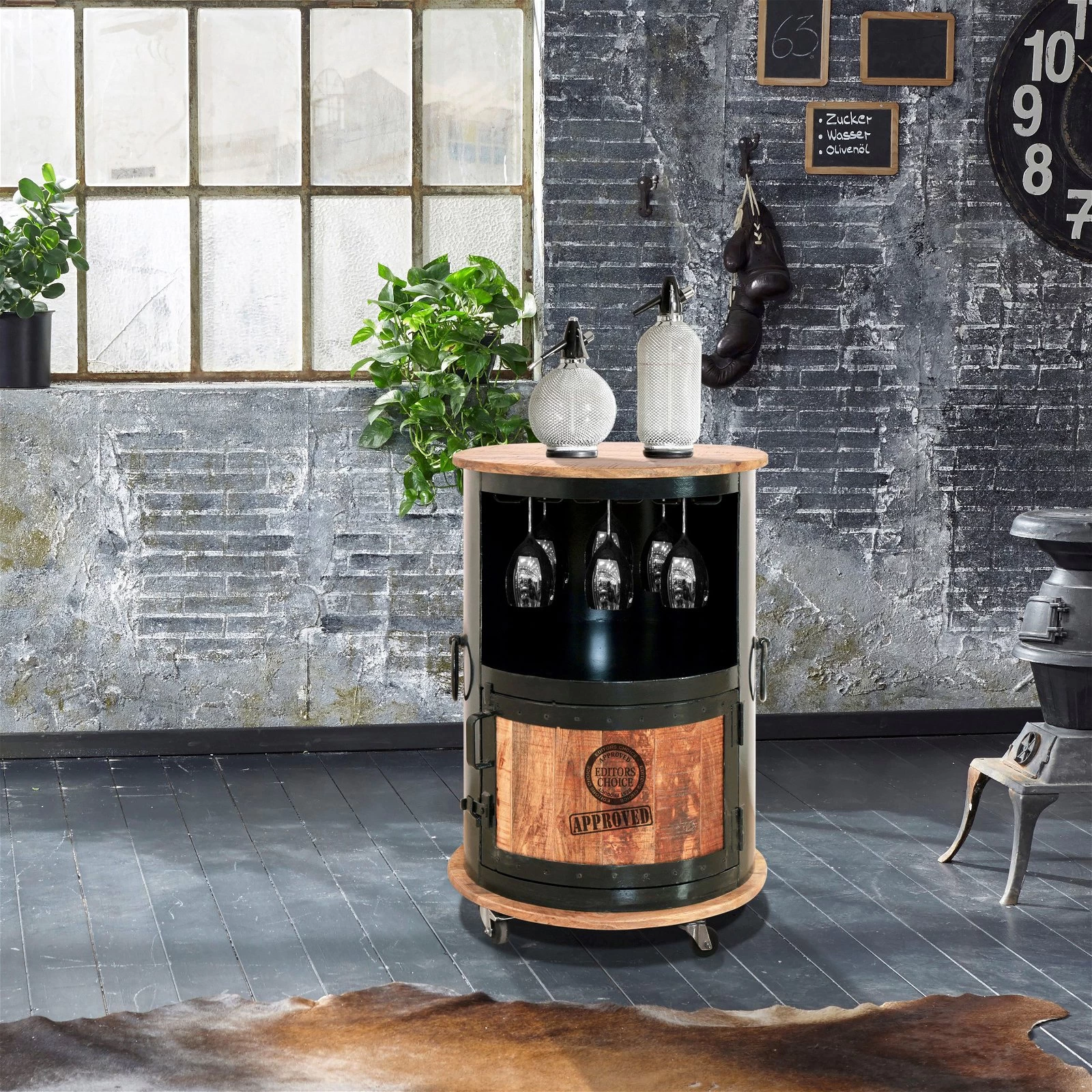 Die IRON Bar im angesagten Industrial Style steht auf stabilen Rollen und macht Ihre Getränke mobil. Diese rollbare Bar präsentiert die edlen Tropfen auf eine vorteilhafte Art und bietet Platz für Flaschen sowie für Gläser und Zubehör. Das Einrichtungsaccessoire ist aus hochwertigem Mangoholz in Kombination mit Eisen gefertigt und detailreich verarbeitet.