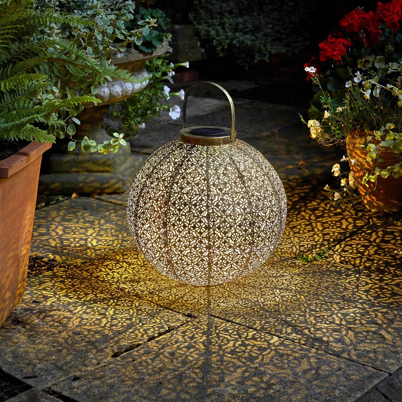 Diese dekorative Solarlaterne beschert Ihnen filigrane Lichtspiele im orientalischen Stil und fügt sich in Ihr Outdoor-Beleuchtungskonzept nahtlos ein. Die solarbetriebene Laterne Giant Damast von Pflanzen Kölle überzeugt mit hochwertiger Verarbeitung und harmonischem, stilsicherem Design. Bei diesem Modell sind langlebige LED-Leuchtmittel eingebaut, die augenfreundliches, warmweißes Licht spenden. Dabei benötigt die Solarlaterne keinen Stromanschluss, da die Akkus sich tagsüber aufladen, um im Dunkeln für verspielte Lichteffekte zu sorgen. An trüben und kurzen Wintertagen können Sie alternativ die Akkus ausbauen und ihnen mithilfe einer Ladestation zu voller Power verhelfen. Die Solarleuchte Giant Damast ist für die Verwendung im Outdoor-Bereich konzipiert. Dieses Accessoire macht im Eingangsbereich von Ihrem Zuhause, auf der Terrasse oder Ihrem Balkon eine gute Figur.