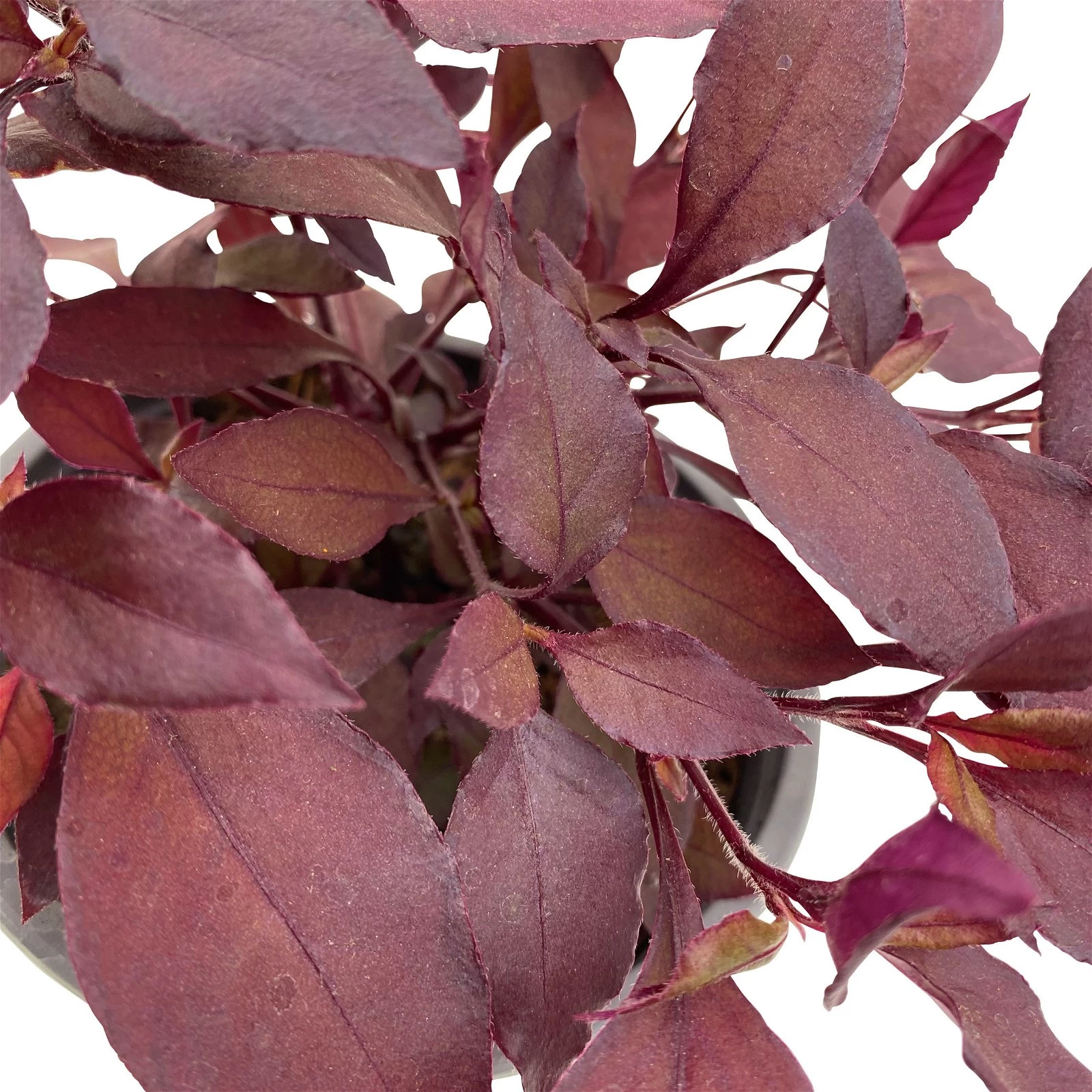 Der Papageienstrauch Alternanthera ‚Little Romance‘ ist in Ihrem Garten oder Balkonkasten ein Hingucker der besonderen Art: Diese erstaunliche Pflanze begeistert nämlich mit zweifarbigen, dekorativen Blättern. Während die Blattoberseite sich in Dunkelviolett präsentiert, erscheint die Unterseite in kraftvollem Rubinrot. Sie können mit gleichem Erfolg den einjährigen, kleinbleibenden Papageienstrauch ‚Little Romance‘ zum Bestücken Ihrer Blumenbeete und als Balkonpflanze einsetzen. An einem sonnigen und halbschattigen Standort fühlt sich die Alternanthera wohl. Eine weitere Voraussetzung für die erfolgreiche Kultur ist ein lockeres, nährstoffreiches und gleichmäßig feuchtes Substrat ohne Staunässe. Der Papageienstrauch ist eine hervorragende Blattschmuckpflanze und lässt sich mit Sommerblumen oder sommerblühenden Stauden zu farbenfrohen Kompositionen kombinieren. Aber auch in Kombination mit Besenheide, Chrysanthemen oder Silberblatt ist er eine schöner Blickfang.