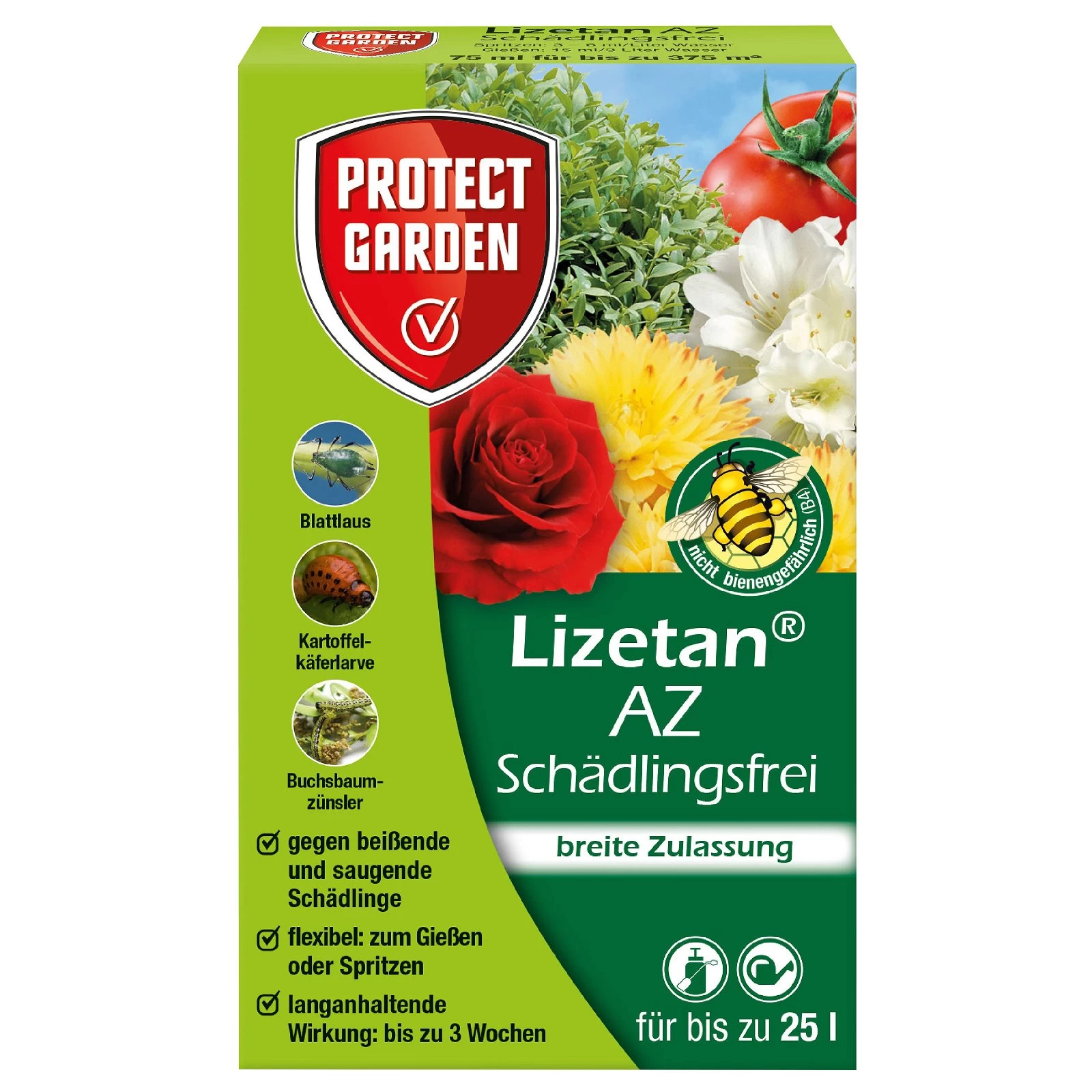 Mit dem Schädlingsfrei ‚Lizetan AZ‘ von ‚Protect Garden‘ gehen Sie wirksam und zeitnah gegen zahlreiche beißende und saugende Schädlinge an Ihren Zier- und Nutzpflanzen vor. Unter anderem erreicht das Pflanzenschutzmittel einen sofortigen Fraßstop bei den gefürchteten Buchsbaumzünslern und Kartoffelkäfern. Erfahrungsgemäß wirkt das Schädlingsfrei außerdem gegen Spinnmilben.