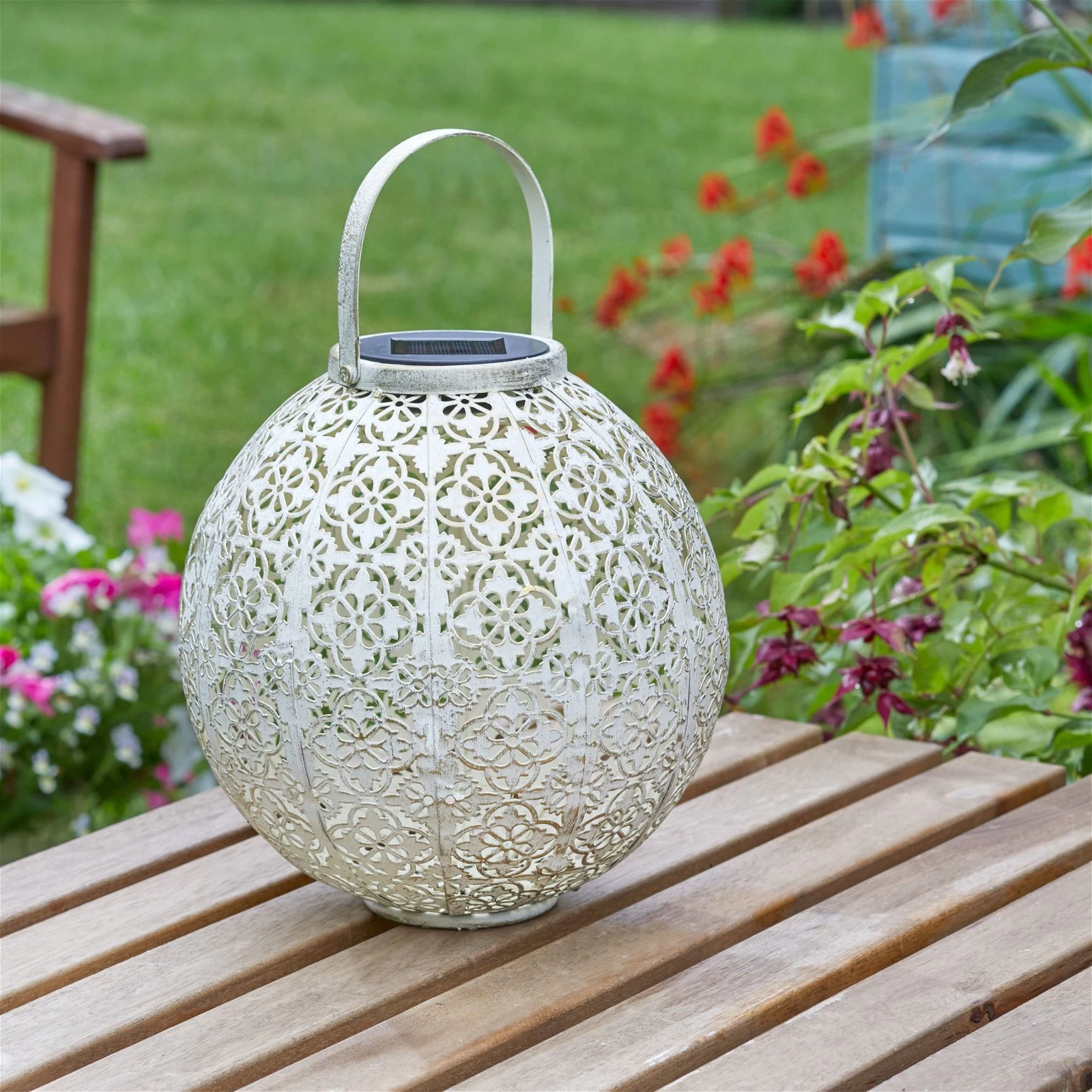 Die außergewöhnliche und besonders hübsche Solarleuchte „Damast“ aus Metall begeistert im nordafrikanischen Design und natürlicher Farbe. Die Solarlaterne in Form einer Kugel ist für den Outdoorbereich bestens geeignet und dafür konzipiert. Am Tag überzeugt die Solar Laterne als charmante Deko, bei Dunkelheit zeigt sie eine spektakuläre Beleuchtung in Ihrem Garten, auf der Terrasse, dem Balkon oder auf dem Weg Ihres Hauses. Mit der schönen Solar Laterne zaubern Sie Stück für Stück eine Wohlfühloase aus Ihrem Garten. Die solarbetriebene Leuchte besitzt ein warmweißes, angenehmes Licht und bringt Helligkeit nach Draußen. Das Muster in der Metallwand der Lampe wird durch das Licht reflektiert und zeichnet wunderschöne Ornamente auf den Boden und die Wand.