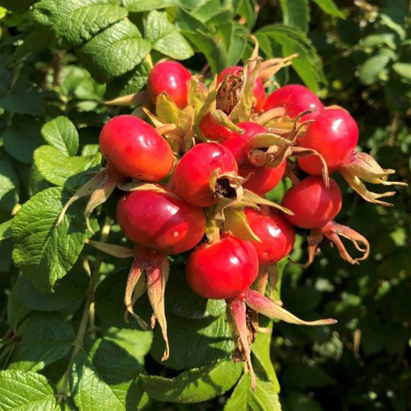 Wenn Sie nach Begrünung für eine Böschung suchen oder eine blühende, unpassierbare Blütengehölz-Hecke gestalten möchten, ist die Strandrose Rosa rugosa die richtige Wahl. Diese öfterblühende Wildrose besticht durch ihre schlichten Blüten mit angenehmem Duft und erfordert nur wenig Pflege. Die Blüten werden gern von zahlreichen Insekten besucht. Im Herbst locken rot-orangefarbene Hagebutten Wildvögel in Ihren Garten und helfen den gefiederten Freunden, den kargen Winter zu überstehen. Die großen Hagebutten der auch Kartoffelrose genannten Wildrose können zu Marmelade verarbeitet werden.