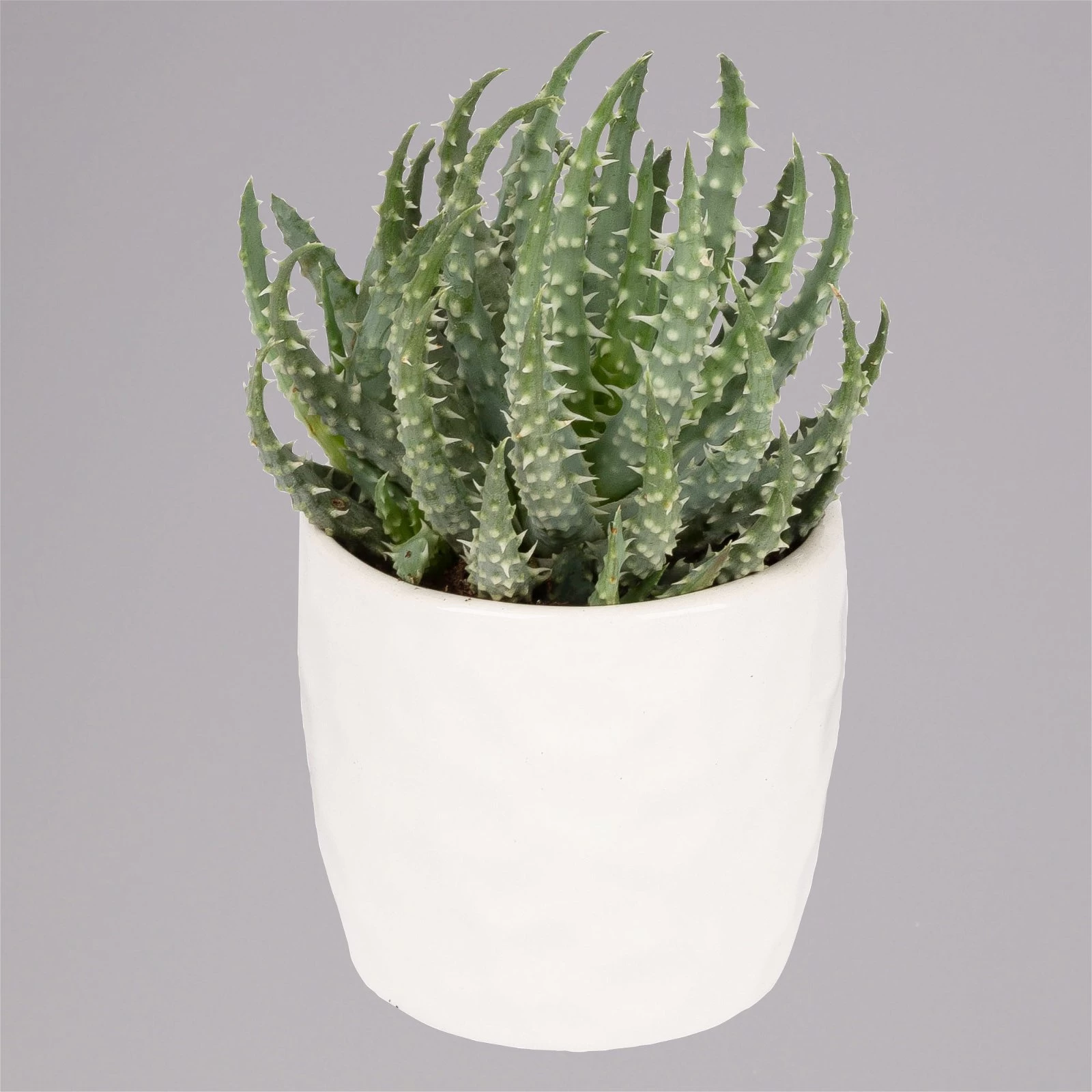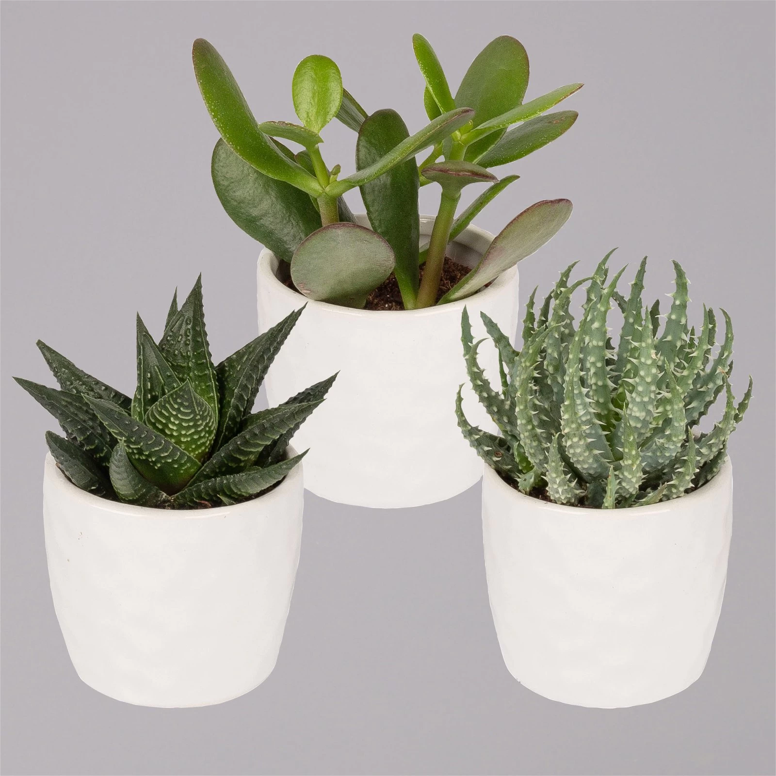 Falls Sie nach einer exotischen Begrünung für Ihr vollsonniges Südfenster suchen, dann bieten sich unsere Minisukkulenten in formschönen Dekotöpfen geradezu an. Diese sukkulenten Zimmerpflanzen sind ausgesprochen pflegeleicht und zeigen eine hohe Toleranz in Hinblick auf die Wassergaben. Lassen Sie das Substrat gründlich antrocknen, bevor Sie Ihre Mini-Sukkulenten wieder gießen. Eine gute Drainage ist für die Pflanzengesundheit entscheidend, daher eignet sich Kakteenerde für die Pflege der Pflanzen am besten. Im Sommer brauchen die Sukkulenten recht viel Wärme, sodass die Raumtemperaturen nicht unter 20 Grad Celsius fallen dürfen. In der kalten Jahreszeit reichen für das Wohlbefinden moderate zehn Grad Celsius aus. Daher sind unsere stylischen Mini-Sukkulenten zum Beispiel auch für einen beheizbaren Wintergarten die richtige Wahl.