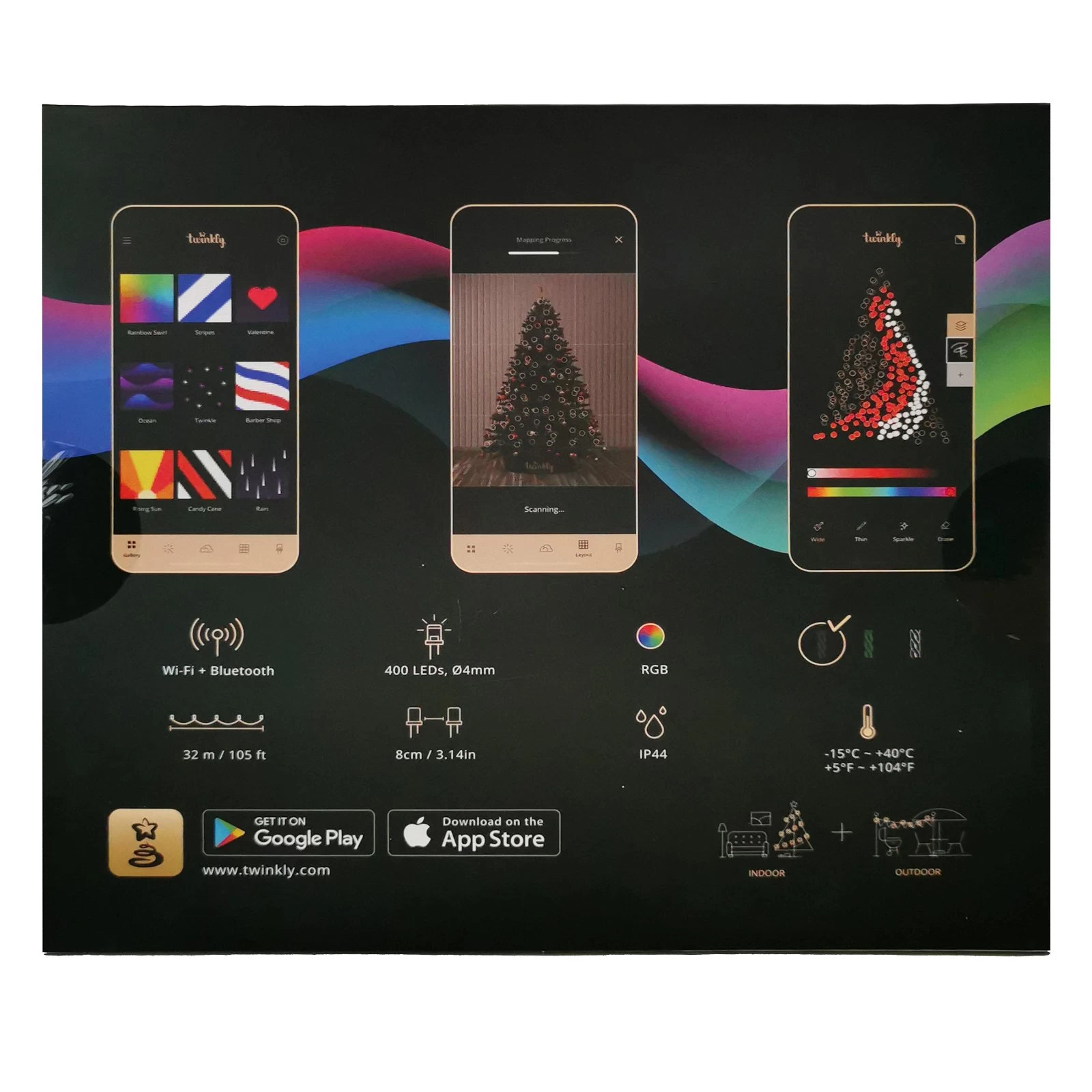 Die LED-Lichterkette Strings von Twinkly mit ganzen 400 energiesparendenden LED-Lichtquellen lässt sich ganz einfach via kompatibler App steuern und begeistert mit individuellen Lichteffekten. Lassen Sie Ihrer Kreativität freien Lauf. Auf Wunsch können Sie die Lichtperformance mit Ihrer Lieblingsmusik unterlegen. Mit Twinkly können sowohl vordefinierte Dekoideen angesteuert als auch einige farbige Lichtszenarien entworfen und jederzeit abgerufen werden. Einfach die kostenlose Twinkly-App herunterladen uns es kann losgehen. Die dekorative Lichterkette ist 32 Meter lang und eignet sich sowohl für In- als auch für Outdoor.
